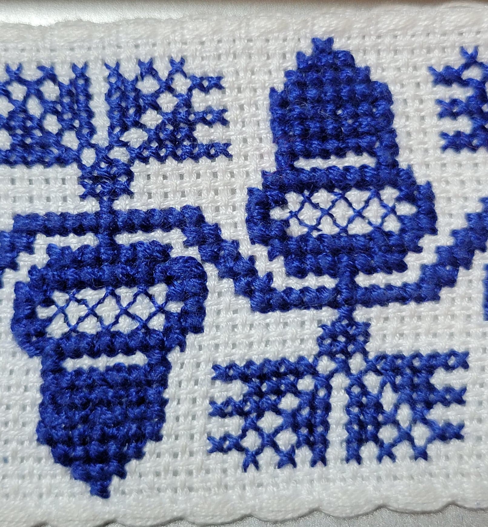 I chose to stitch mine in blue instead of red to go with Caidian (or Dreiburgen) colors. The ribbon fabric we chose to use was one square too narrow to fit the pattern (without the border), so I modified the pattern to fit by removing one row of the vine. While I was at it, I removed the vine curls, and made the acorns less square.