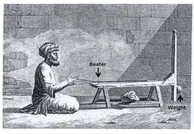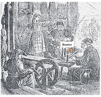 Just like the German print, this stand has a beater on the front of the stand (right hand side). It's hard to see the back end of the loom (left hand side), but it seems like it would also has a weight to take up the finished braid. |