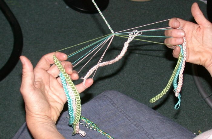 They have tied the braid to a post and the helper moves the point of braiding to the finished cord and